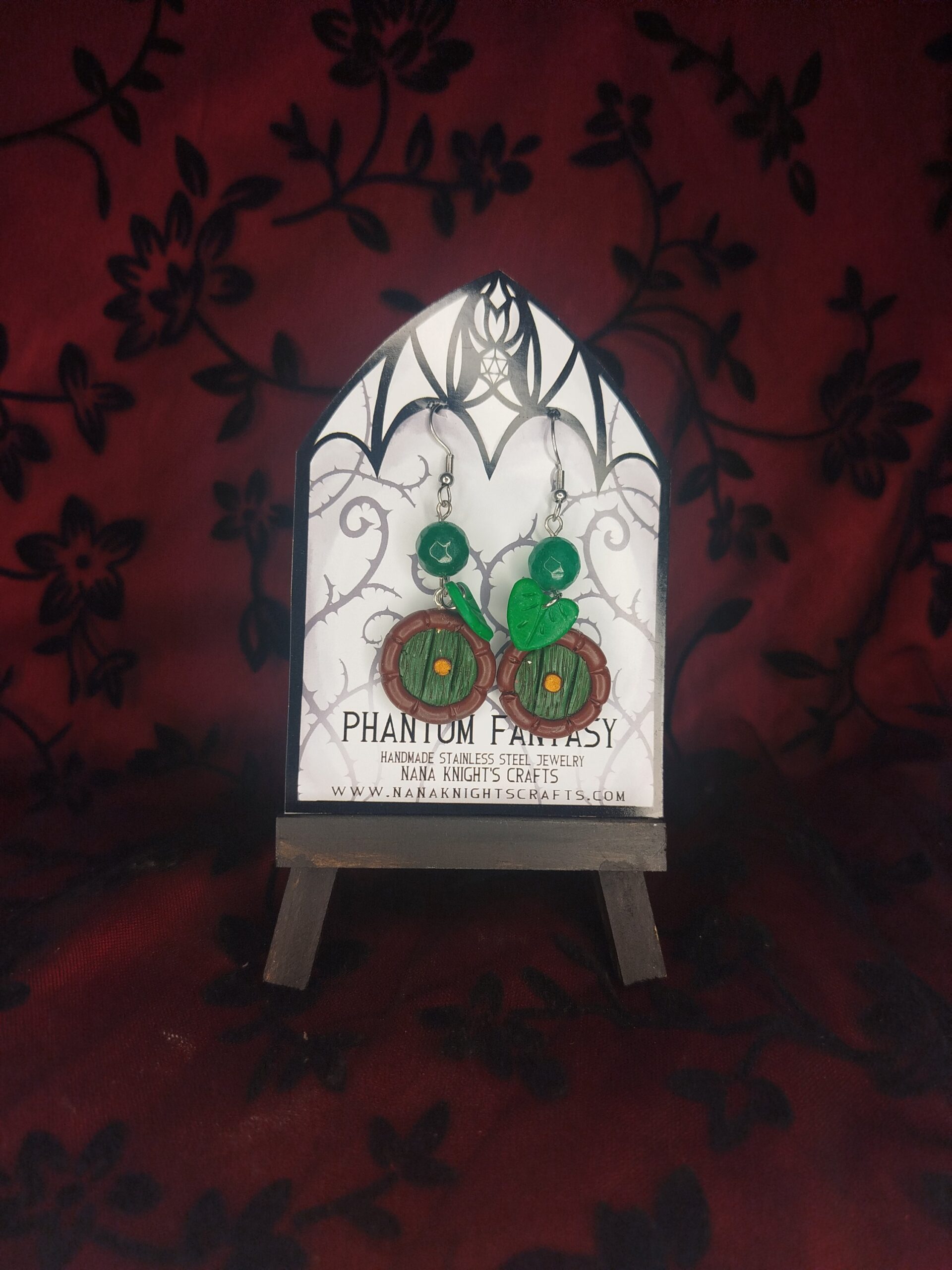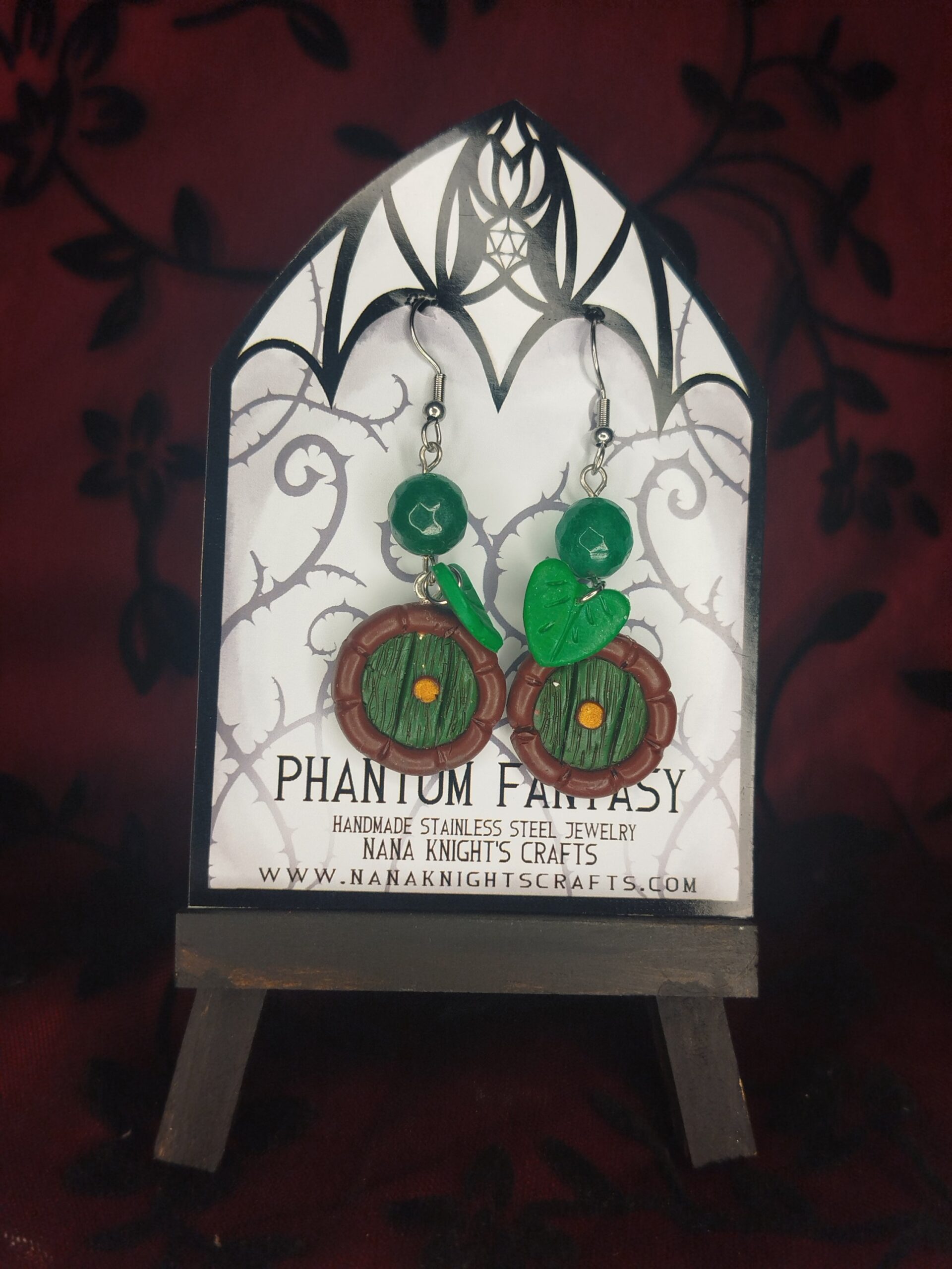Süthető gyurmából készült Hobbitlak ajtaját reprezentáló medállal, süthető gyurma levelekkel és üveg gyöngyökkel díszített kézműves nemesacél fülbevaló.