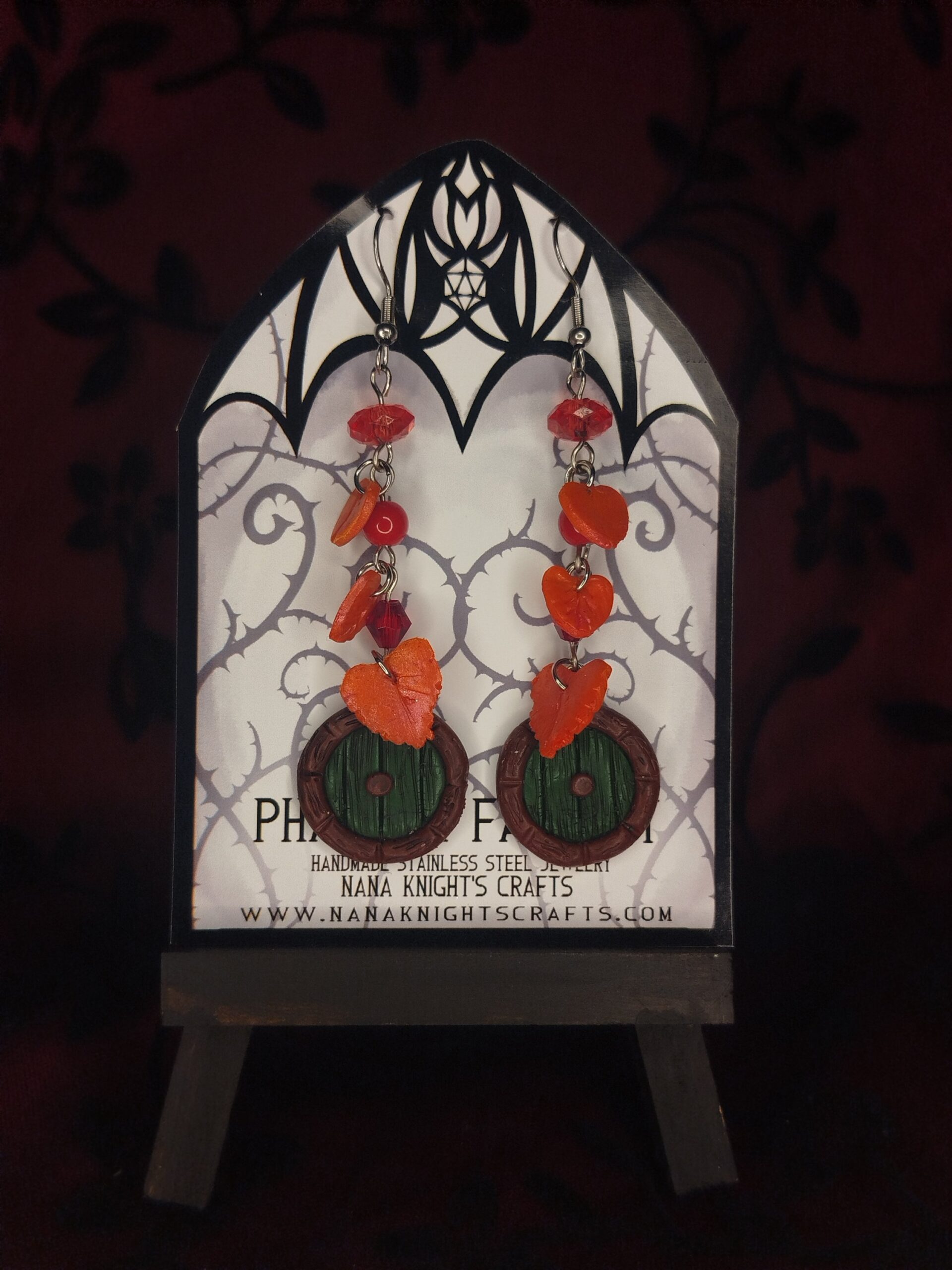 Süthető gyurmából készült Hobbitlak ajtaját reprezentáló medállal, süthető gyurma levelekkel és akril gyöngyökkel díszített kézműves nemesacél fülbevaló.