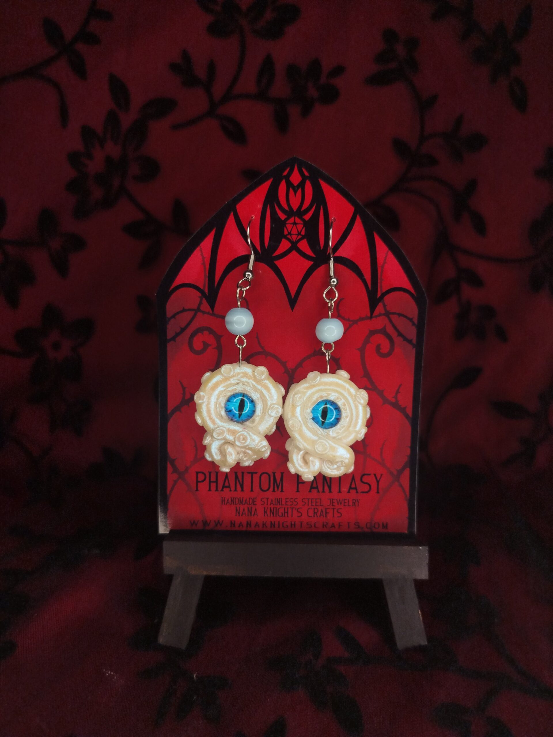 Süthető gyurmából készült nemesacél szerelékkel ellátott fülbevaló szelenit gyönggyel.