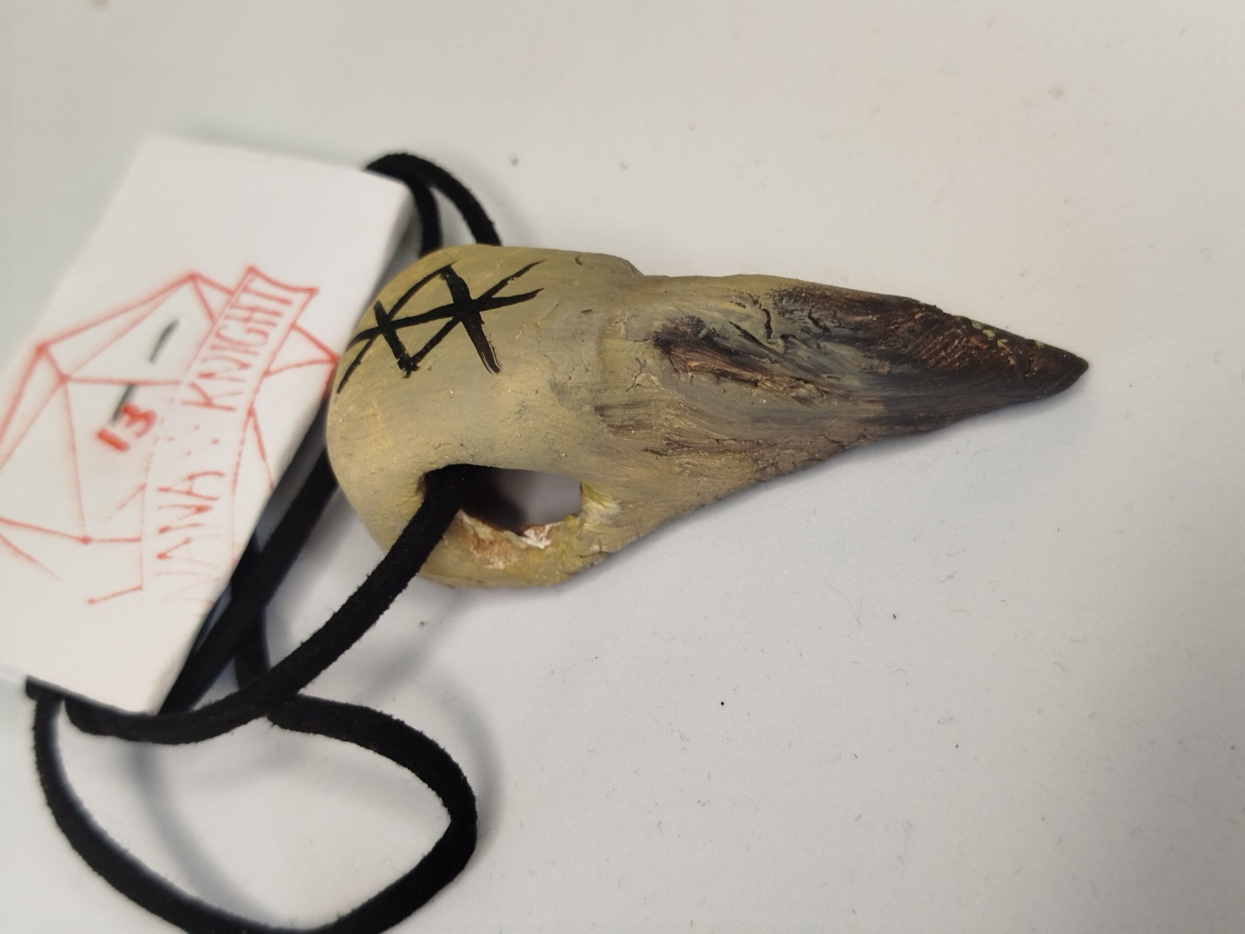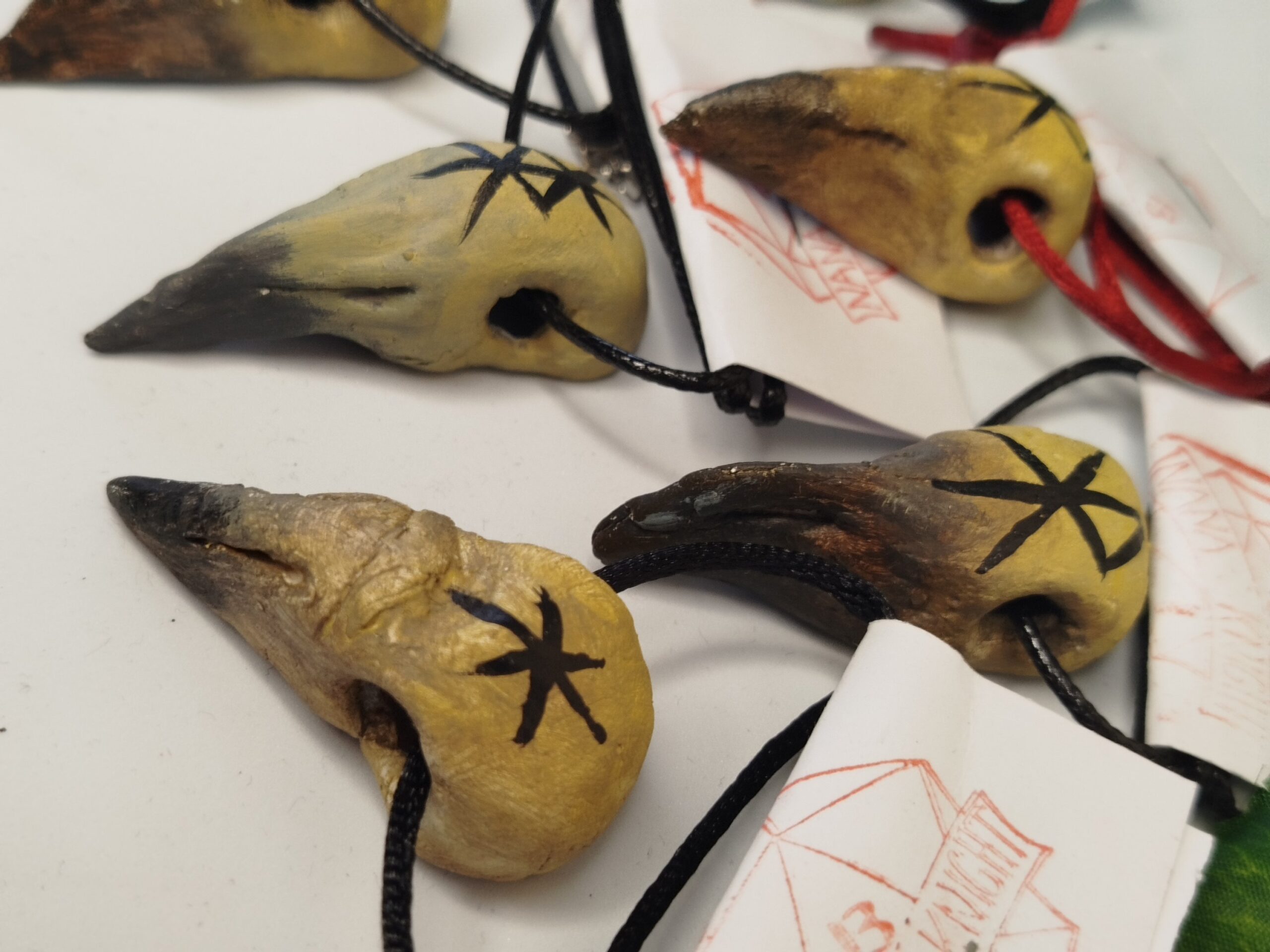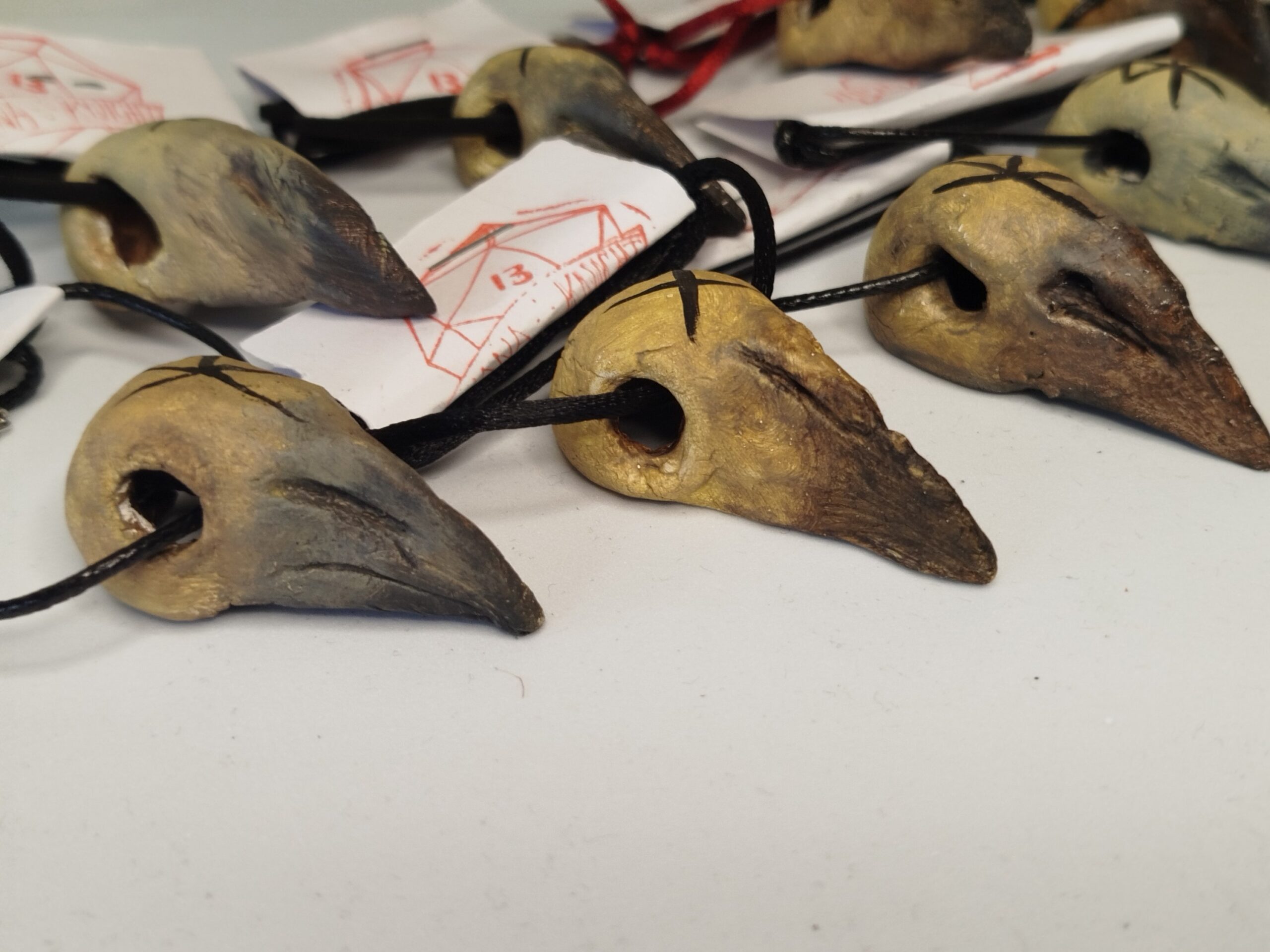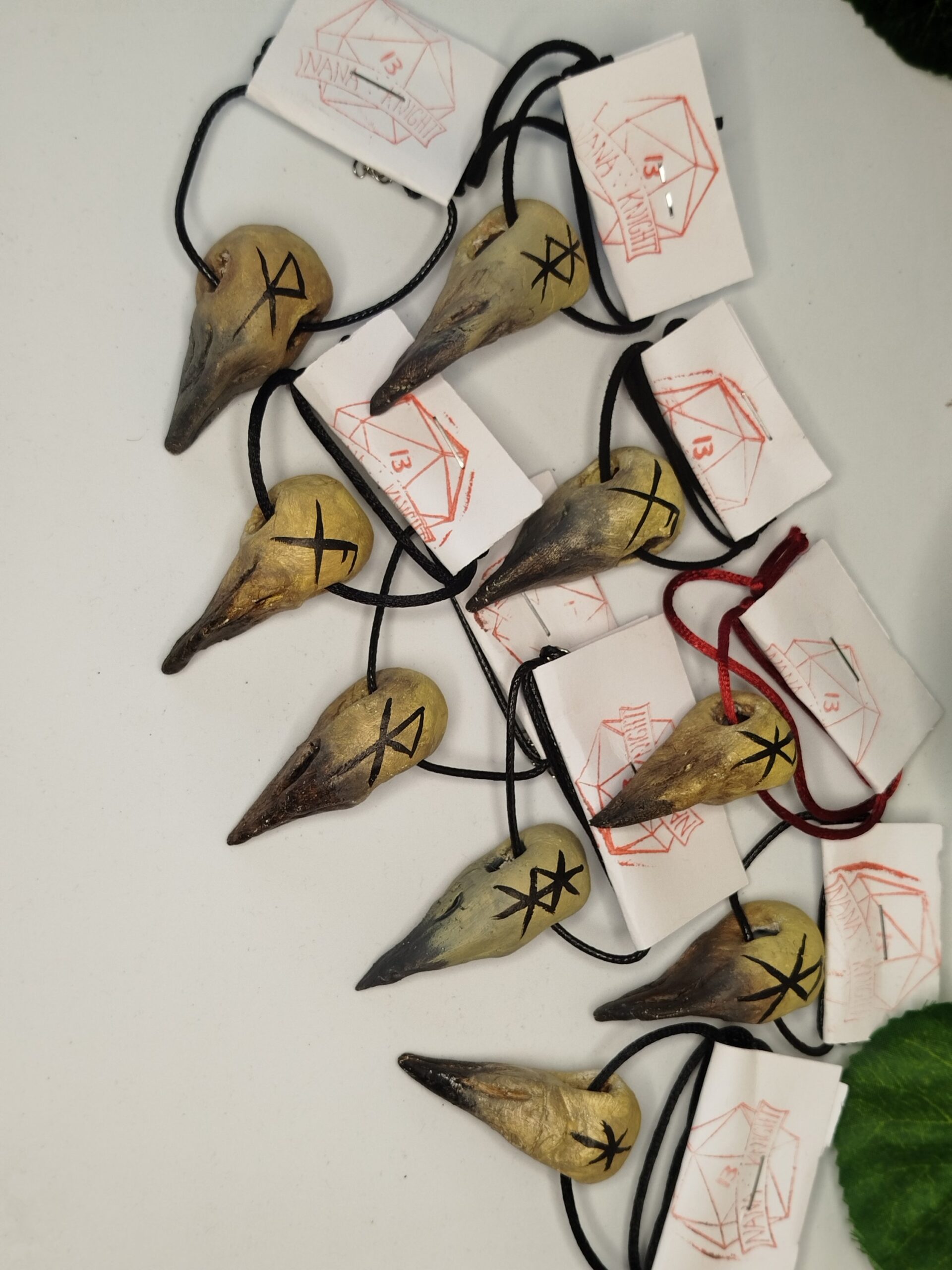 Agyagból kézzel formázott varjú koponya medálok felrúnázva Futhark alapú „kötött” rúnákkal. A rúnák jelentését a termék képek közt találod!